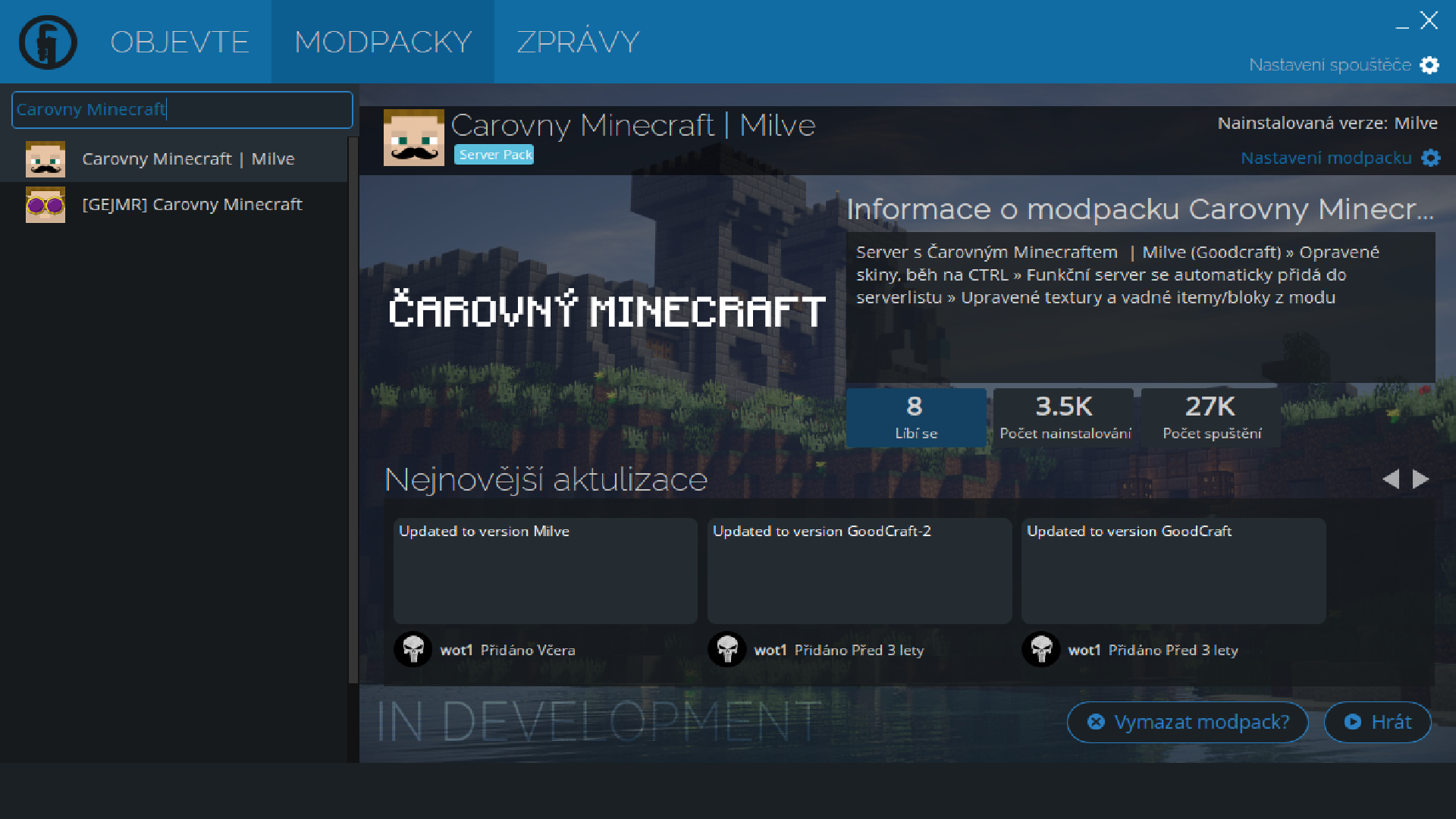 Jakmile launcher máme, musíte najít náš nebo Gejmrův modpack. Doporučujeme náš, jelikož v